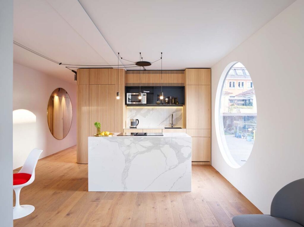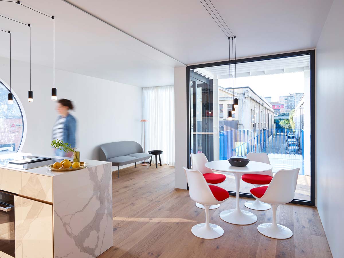 Instalaron dos viviendas de muestra. La primera en un único containers marítimo largo, de 40 pies, sobre el nivel del suelo, con un apartamento más grande de dos módulos atornillados uno al lado del otro. Los interiores de ambos fueron equipados con accesorios de alta gama y accesorios para crear un sentido de lujo y contraste con el exterior industrial de los contenedores marítimos. «Cuando la gente mira a su alrededor dicen, ‘Nunca pensé que podría hacerlo en un contenedor‘«, dice Christine Schaal, el jefe de diseño de Containerwerk.