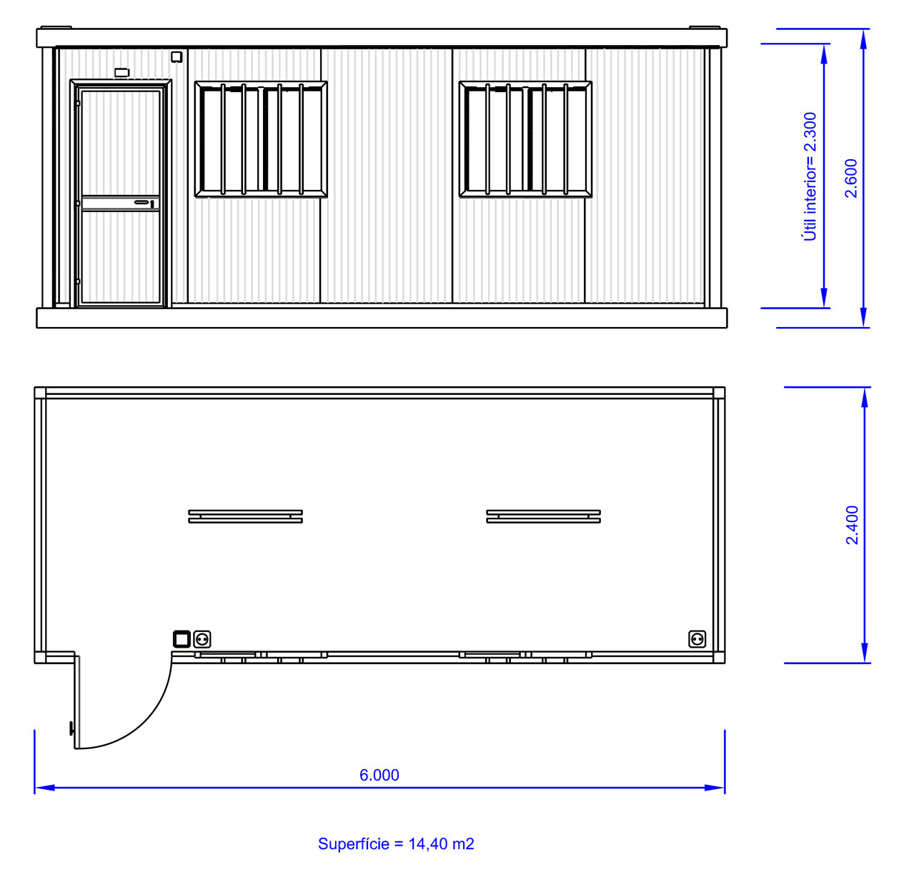 El módulo oficina OFI66 con sus 6 m. de longitud es el estándar en oficinas de obra, es ensamblables y apilable. La medida ideal para su oficina.