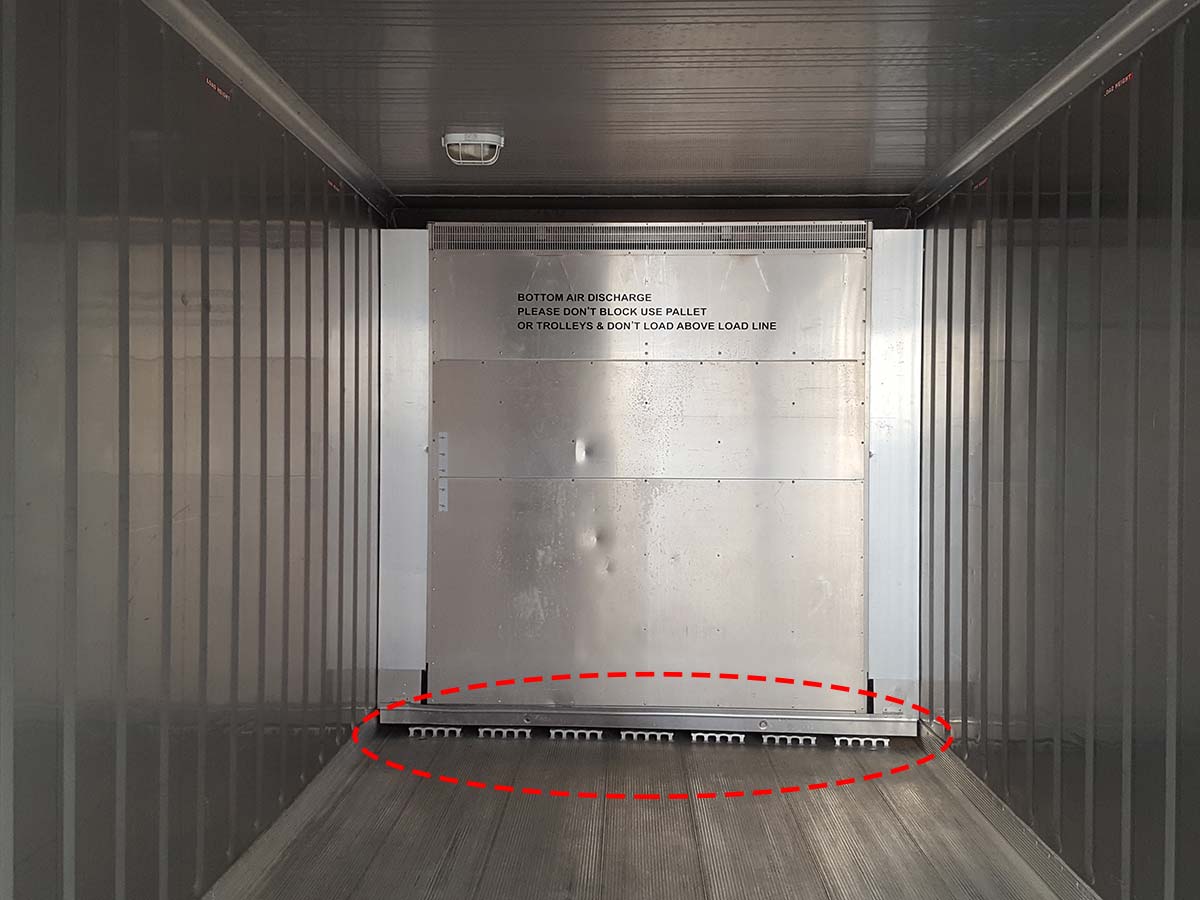 No hay que dejar huecos entre pallets ya que se producirían remolinos de aire en estos espacios y por tanto el aire no circulará correctamente y, sobre todo, nunca sobrepasar la línea roja que determina el límite de altura de la carga de la cámara frigorífica portátil. Hay que dejar ese espacio para que pueda circular el aire de retorno.